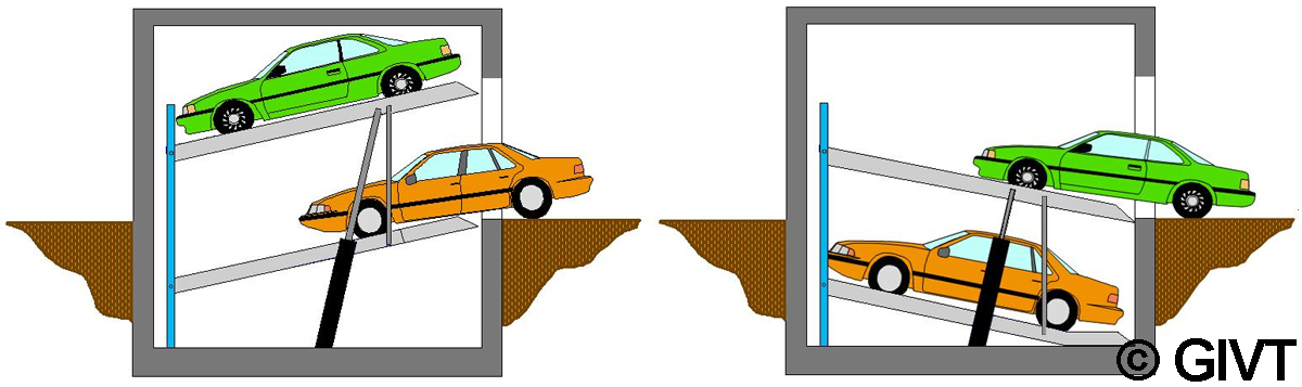 | Kipp-Parker ermöglichen ein besonders kompaktes Parken, schränken aber die Benutzerfreundlichkeit erheblich ein und lassen auf der oberen Plattform nur Fahrzeuge mit niedrigem Heck zu |