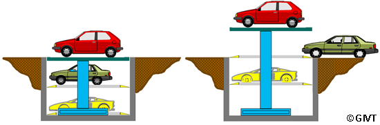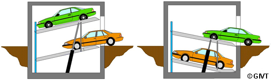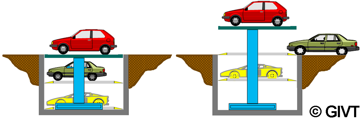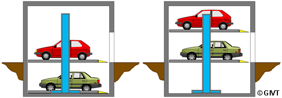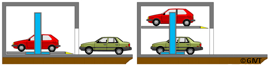 | Doppel-Parker mit horizontal befahrbaren Plattformen (Lift-Parker) für das Parken von 2 Pkw übereinander mit unabhängigem Zugriff auf beide Plattformen |