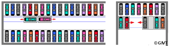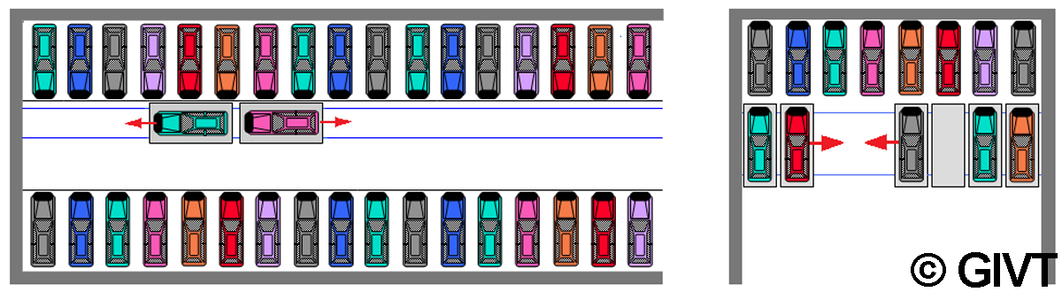 | Verschiebepaletten zur Schaffung zusätzlicher Stellplätze in der Fahrgasse eines Parkhauses (links) oder für zusätzliche Stellplätze hintereinander (rechts) |