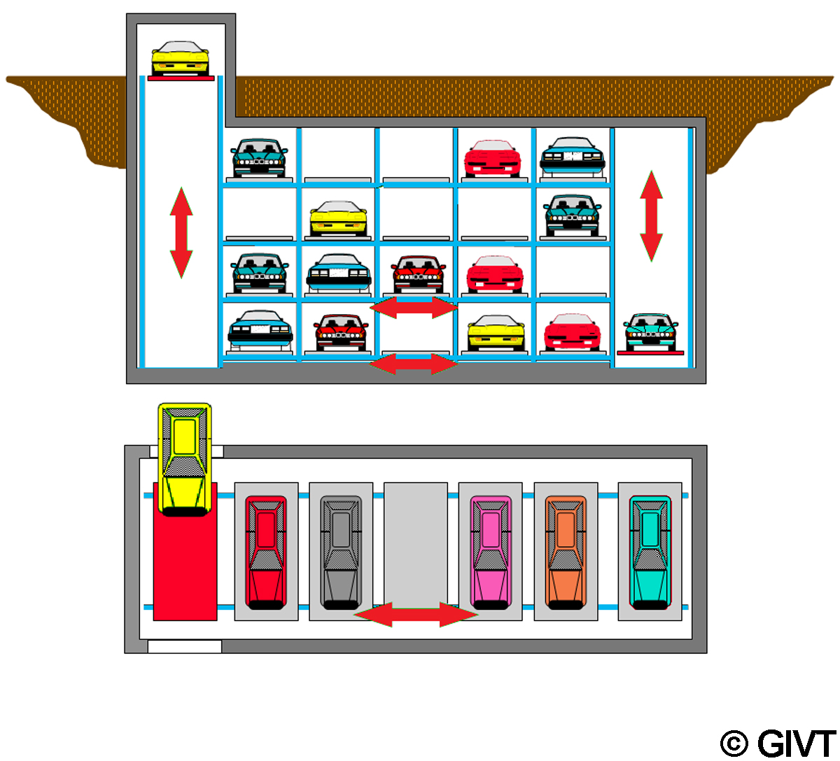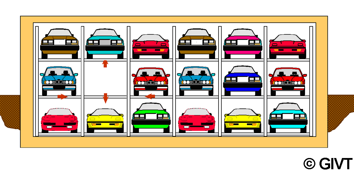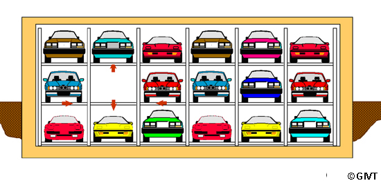 Parkbühnen mit Verschiebepaletten Bei Parkbühnen mit Verschiebepaletten sind die Parkpaletten in der Einfahrtebene jeweils horizontal, quer zur Einfahrtrichtung verschiebbar. Die Parkpaletten auf darüber oder darunter liegenden Stellplätzen sind jeweils vertikal in die Einfahrtebene holbar. Deshalb muss in der Einfahrtebene ein Leerplatz vorgesehen werden. Das Ein- und Ausparken erfolgt jeweils über das entsprechende vertikale Raster der Parkebene.