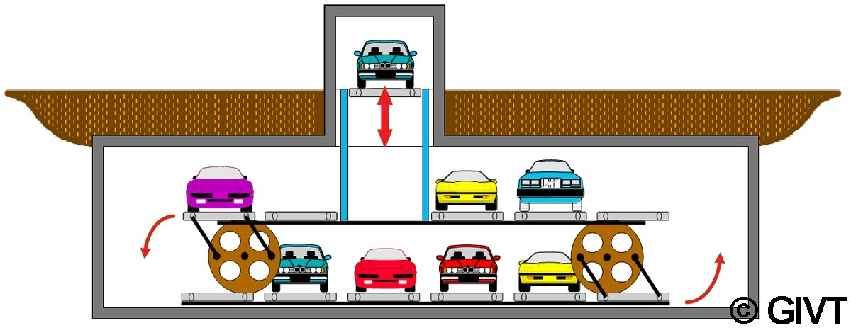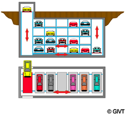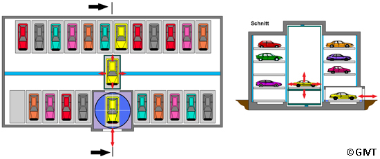 | Beim vertikalen Parkregal mit nur einer Regalreihe werden die abzustellenden Fahrzeuge nach dem Transport auf die entsprechende Parkebene in den Stellplatz unmittelbar neben dem Vertikalförderer eingelagert. Dieses System gestattet eine besonders Grundfläche sparende Systemgestaltung in unter- oder oberirdischer Bauart und ist gut modular einsetzbar. |