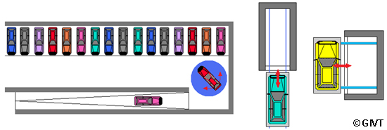 | Anwendungsbeispiele für mechanische Einparkhilfen: Drehplatte als Rangierhilfe in einer sehr eng bemessenen 180° Kurve in einer Tiefgarage (links), Verschiebepaletten als Einfahrhilfen für besonders enge Einzelgaragen (mitte und rechts) |